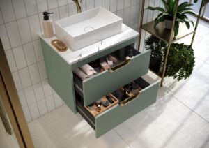 Aubrey offers three different trend finishes: Davos Oak, Dust Grey, and Reed Green. Davos Oak is perfect in bathroom design to create a warm and calming effect of wood. Dust Grey is a mid-grey and Reed Green brings a calming vibe to create a modern looking bathroom.