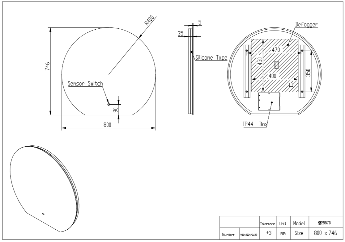 The backlit mirror enhances the circular shape and provides an ambient glow, and the built-in demister pad prevents steaming. The touch switch power control adjusts between cool and warm LED lighting.